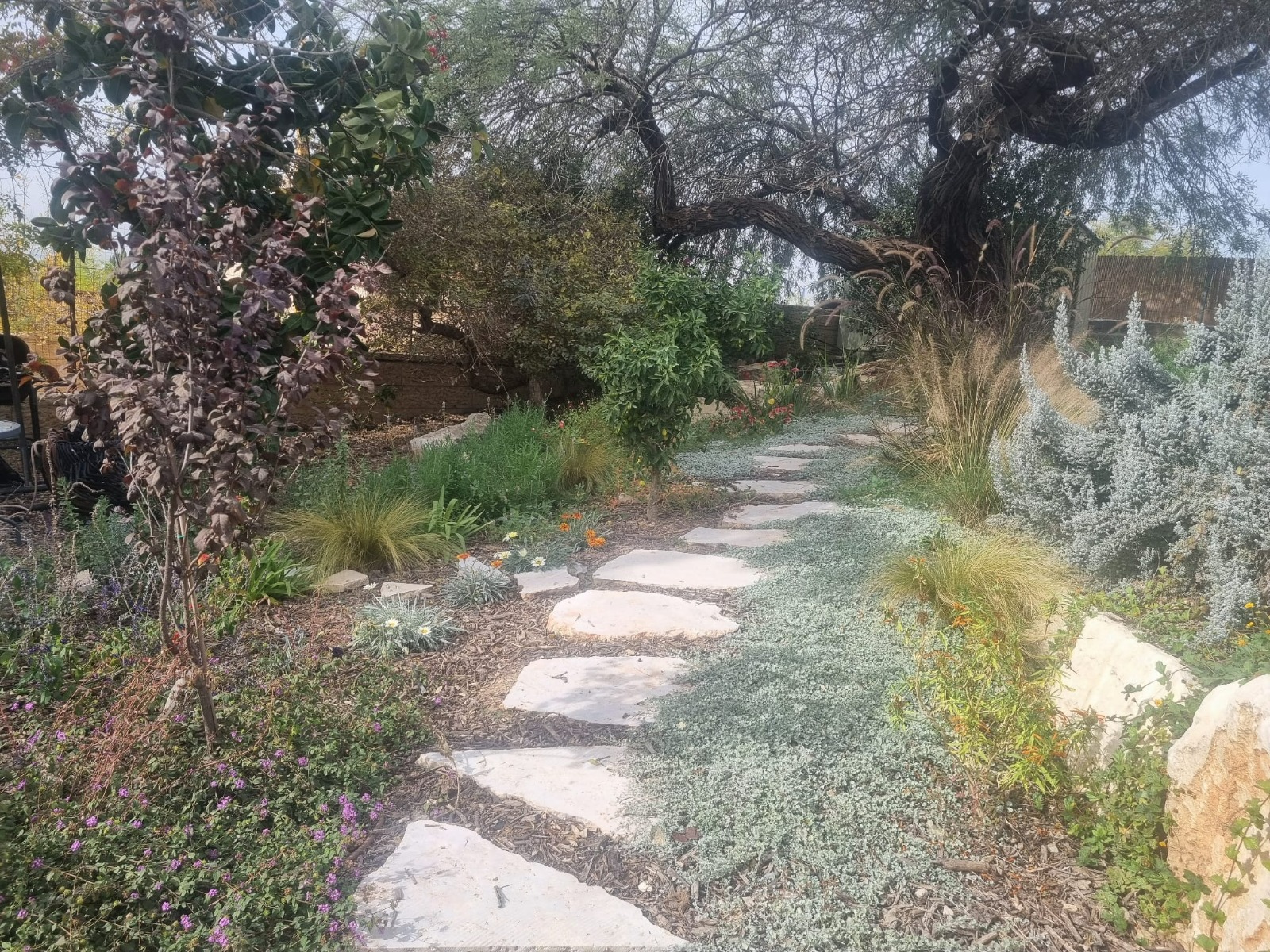 גינה זו מורכבת מעצי צל ופרי, צמחי מרפא ותבלין, ירקות מאכל, פרחים, פקעות וצמחי נוי צבעוניים המותאמים לאזור, תנאי מזג האוויר וחסכוניים במים.